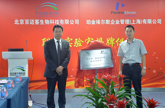 8月14日,北京百邁客生物科技有限公司與珀金埃爾默企業(yè)管理(上海)有限公司舉行了聯(lián)合實驗室揭牌儀式。北京百邁客生物科技有限公司創(chuàng)始人、董事長兼 CEO鄭洪坤先生,珀金埃爾默亞太區(qū)生命科學(xué)副總裁兼總經(jīng)理、大中華區(qū)總裁顧憲進先生,偕同多位雙方代表參加了揭牌儀式。