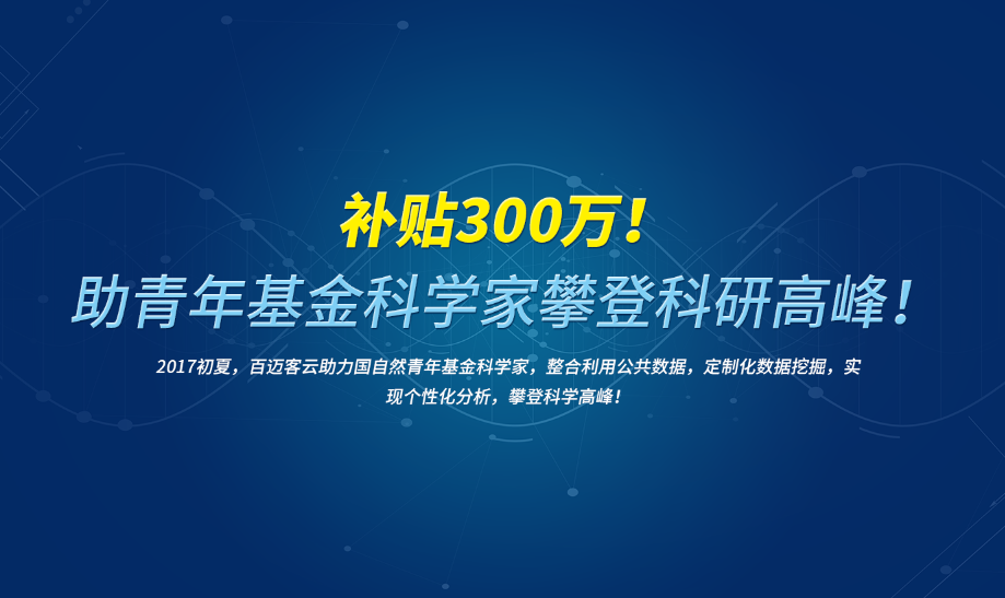 2017初夏,百邁客云助力國(guó)自然青年基金科學(xué)家,整合利用公共數(shù)據(jù),定制化數(shù)據(jù)挖掘,實(shí)現(xiàn)個(gè)性化分析,攀登科學(xué)高峰!
