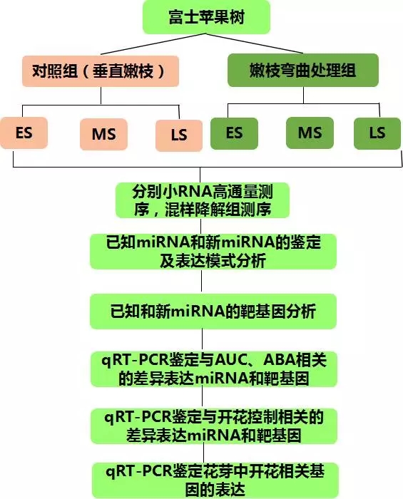 生長六年大小的富士蘋果樹,分兩組進(jìn)行嫩枝彎曲(110度)、對照處理(垂直嫩枝),分別在開花誘導(dǎo)的初期(early stage,ES)、中期(Middle stage,MS)和晚期(Later stage,LS)取花芽,分別提取RNA進(jìn)行小RNA測序,6個花芽組織RNA混樣進(jìn)行降解組測序。