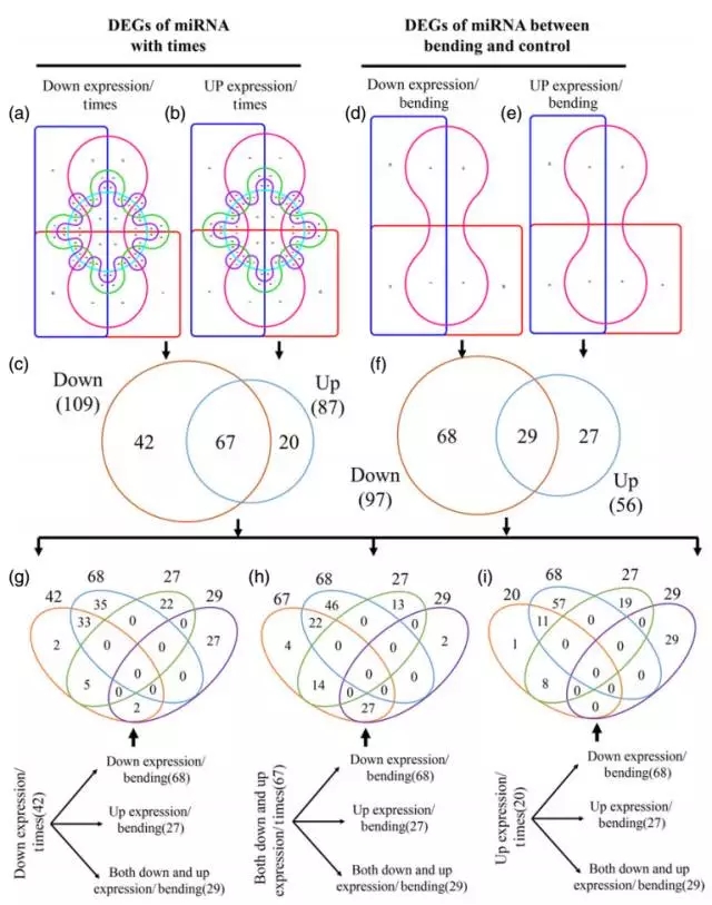 對同一處理不同發(fā)育時期樣品間(CMS vs CES, CLS vs CMS, CLS vs CES, BMS vs BES, BLS vs BMS and BLS vs BES)篩選了差異表達(dá)miRNA并繪制了維恩圖。結(jié)果顯示,其中42個miRNA下調(diào)表達(dá),20個miRNA上調(diào)表達(dá)。對不同處理相同發(fā)育時期樣品間(BES vs CES, BMS vs CMS and BLS vs CLS)篩選到124個差異表達(dá)miRNA,相對對照組,嫩枝彎曲處理組中68個下調(diào)表達(dá),27個上調(diào)表達(dá)。