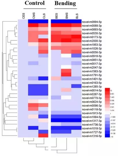 對嫩枝彎曲處理組和對照組間的31個差異表達(dá)新miRNA進(jìn)行表達(dá)層次聚類分析。結(jié)果顯示,根據(jù)表達(dá)模式可分為5個亞簇。其中Cluster 1中的6個新miRNA在嫩枝彎曲組表達(dá)量均高于對照組。Cluster 5中的新miRNA表達(dá)模式則與Cluster 1中相反。其他三簇中的19個新miRNA,無論在對照組還是嫩枝彎曲處理組,展現(xiàn)出較低的表達(dá)水平。