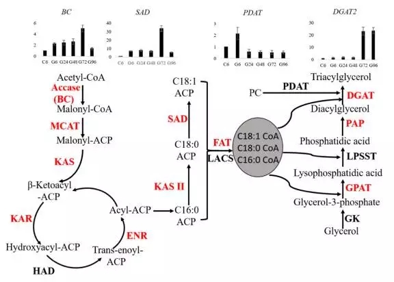 藻類和植物中脂肪酸的生物合成主要在葉綠體中進(jìn)行。乙酰-CoA作為合成的起始物質(zhì)?;谵D(zhuǎn)錄組測序,小球藻質(zhì)體中脂肪酸合成基因被鑒定到。在葡萄糖處理情況下,這些基因大都表達(dá)量上調(diào)。另外這次測序結(jié)果中還發(fā)現(xiàn)幾個(gè)基因?qū)?yīng)的不同轉(zhuǎn)錄本。由于BC和SAD是脂肪酸合成的限速酶基因,做了進(jìn)一步分析,發(fā)現(xiàn)BC和SAD表達(dá)量從6h到72h表達(dá)量持續(xù)上升,對應(yīng)的三酰甘油含量從24h到96h持續(xù)增加。
