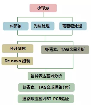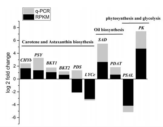 作者選了10個(gè)與蝦青素和三酰甘油合成有關(guān)的unigenes進(jìn)行了RT-PCR驗(yàn)證,其中9個(gè)基因的表達(dá)趨勢與RNA-seq結(jié)果一致。只有PDS兩種結(jié)果不同,可能是RNA-seq結(jié)果不準(zhǔn)確,因?yàn)榍叭说难芯砍晒?,葡萄糖是上調(diào)PDS表達(dá)的,與本文中RT-PCR結(jié)果一致。