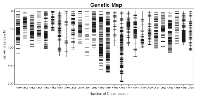 (2)重組熱點分析發(fā)現(xiàn)26條連鎖群中,21條含有重組熱點區(qū)域,A套中9條LG含有重組熱點,D套中12條LG含有重組熱點。所有LG中,13號含有重組熱點最多,有196個。