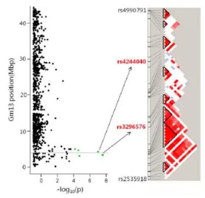 (3)基于獲得的25179個(gè)SNP,采用Naive、GLM 和CMLM 三種模型進(jìn)行關(guān)聯(lián)分析,在Gm13上定位到3個(gè)熱點(diǎn)標(biāo)記,通過(guò)比較發(fā)現(xiàn)GWAS和遺傳圖QTL定位結(jié)果是重疊的。進(jìn)一步對(duì)候選基因進(jìn)行功能注釋,有4個(gè)基因與植物病害應(yīng)答機(jī)制或色素合成有關(guān)。