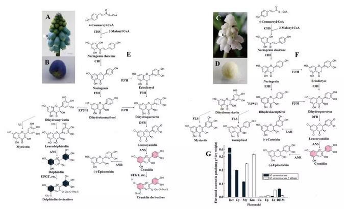 葡萄風(fēng)信子(Muscari)是一種重要的觀賞性球根植物,具有獨(dú)特藍(lán)色、花形和甜香。天然突變種白色風(fēng)信子為探究某些潛在生化特征,特別是顏色相關(guān)的復(fù)雜代謝網(wǎng)絡(luò)研究提供了機(jī)會(huì)。據(jù)報(bào)道,花青素是風(fēng)信子花色的主要色素。藍(lán)色花主要由飛燕草色素(Del)決定,紅色花由花青色素(Cy)決定?;ㄇ嗨厥侵参锟茖W(xué)中研究最多和最了解的化合物之一,然而,在不同植物中調(diào)控花青素分解代謝的分子機(jī)制還遠(yuǎn)遠(yuǎn)沒有定論。