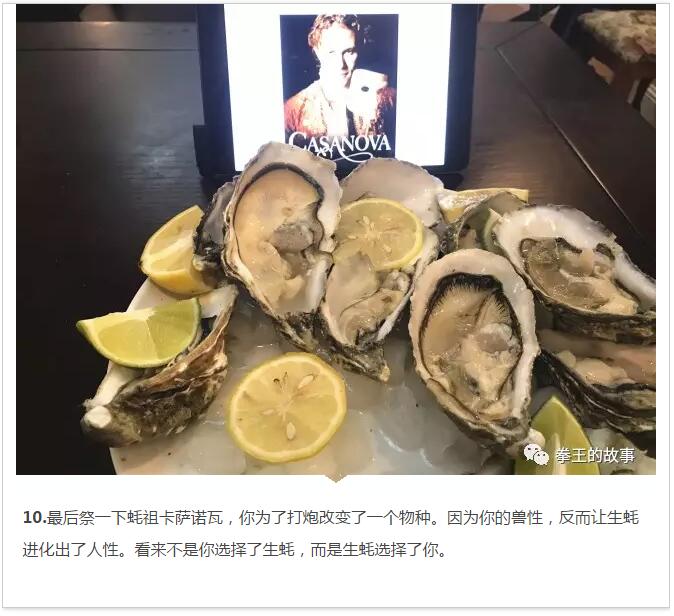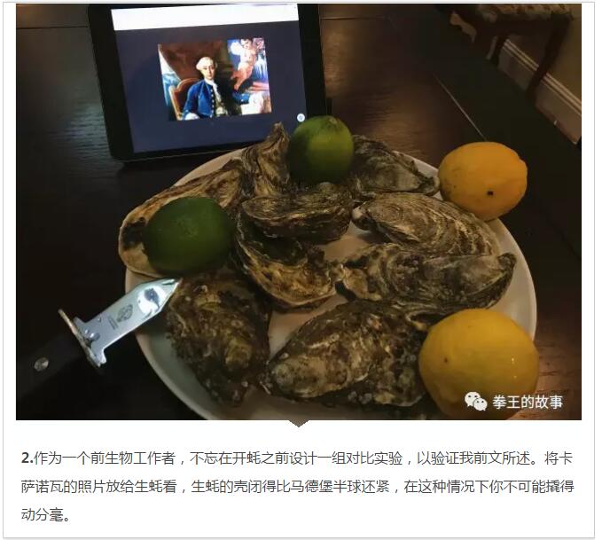 我曾經(jīng)做過(guò)一個(gè)實(shí)驗(yàn),把卡薩諾瓦的畫像放在一盤生蠔面前,然后用有道詞典里的意大利語(yǔ)發(fā)音反復(fù)播放“Giacomo Girolamo Casanova”,這盤生蠔當(dāng)時(shí)就怒了,以至于我把他們放到烤箱里烤了20分鐘都無(wú)法將殼撬開(kāi)。—–在殺父之仇面前,生蠔們突破了自己的生理極限。