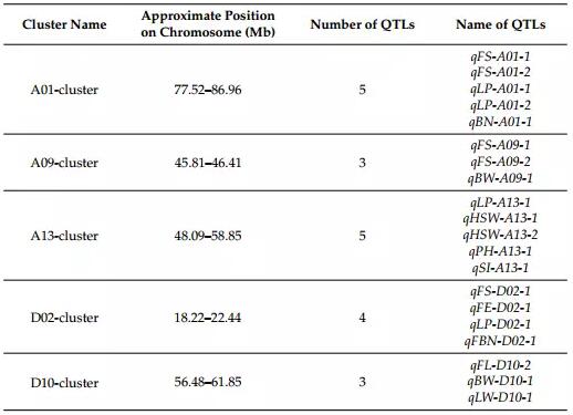 作者以10 Mb(?20 cM)物理區(qū)域包含兩個或多個QTL定為QTL簇標準。在5條染色體上檢測到5個QTL簇,每個簇至少有3個QTL(表1)。其中3個位于A基因組,2個位于D基因組中。鑒定出含有影響纖維品質(zhì)和產(chǎn)量性狀的多個QTL的基因組區(qū)域,有利于后期分子改良。