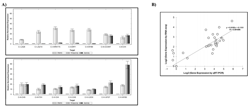 隨機(jī)挑選 14 個(gè)基因進(jìn)行 RT-RCR 驗(yàn)證,結(jié)果表明 Cluster I和Cluster II 中的基因(JAZ8, JAZ10, WRKY75, ERF1 和 MYB9)在 Hongyoung 的表達(dá)量較高;ClusterIV中的基因(MYB3和UFGT)在Jayoung中表達(dá)水平較高;而 Cluster III 中的基因在 Hongyoung 和 Jayoung 中的表達(dá)水平無(wú)明顯差異。RNA-seq和RT-PCR相關(guān)性系數(shù)0.89,進(jìn)一步證明測(cè)序結(jié)果的準(zhǔn)確性。