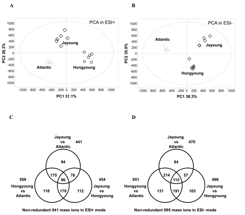 對(duì)三種不同色澤馬鈴薯樣本進(jìn)行主成分分析,結(jié)果顯示不同品種馬鈴薯代謝物差異顯著。代謝組檢測(cè)表明,在正離子模式下,共檢測(cè)出841個(gè)信號(hào)離子,其中Hongyoung和Atlantic共有559個(gè)信號(hào)離子,Jayoung 和Atlantic 共有441個(gè)信號(hào)離子,Jayoung 和Hongyoung 共有 454 個(gè)信號(hào)離子;在負(fù)離子模式下,共檢測(cè)出895個(gè)信號(hào)離子,其中Hongyoung 和 Atlantic共有 651 個(gè)信號(hào)離子,Jayoung 和Atlantic 共有470個(gè)信號(hào)離子,Jayoung和Hongyoung共有 466 個(gè)信號(hào)離子。