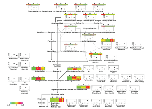 花青素是苯丙素通路中類黃酮合成的花色素苷的?;擒?。據(jù)報(bào)道,花青素衍生物飛燕草色素(Dp),芍藥色素(Pn)和錦葵色素(Mv)是紫色和深色的色素來(lái)源,而花青色素(Cy)和花葵素(Pg)的衍生物是亮紅色果實(shí)中的主要色素。結(jié)果顯示,Hongyoung與Jayoung在苯丙素合成途徑下游的黃酮類組分差異顯著,表明這些代謝物可能是造成馬鈴薯品種間色澤差異的關(guān)鍵因素。Hongyoung中芹黃素、山柰酚、二氫山柰酚和天竺葵色素衍生物的含量較高,而Jayoung中芍藥花青素、牽?;ㄉ?、飛燕草色素和錦葵色素衍生物積累較多。