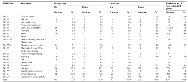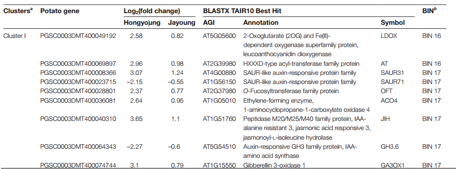 Hongyoung 、 Jayoung和Hongyoung 和 Jayoung共1044個(gè)差異基因;Hongyoung 和 Atlantic 中有 756 個(gè)差異基因,其中482 個(gè)基因上調(diào),274 個(gè)基因下調(diào)。Jayoung 和 Atlantic 中有519 個(gè)差異基因,其中有248個(gè)上調(diào)基因,273個(gè)下調(diào)基因。根據(jù)其注釋功能將其分為20組(主要BIN),分為未知注釋轉(zhuǎn)錄本(37.7%),蛋白質(zhì)活性調(diào)控(10.3%),應(yīng)激(9.6%) ,其他代謝(7.3%),轉(zhuǎn)錄調(diào)控因子(5.7%),次級(jí)代謝(5.3%)和信號(hào)傳導(dǎo)(4.0%)。