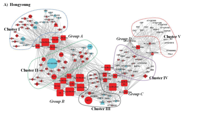 Hongyoung中 Group A 代謝物的含量高于Jayoung,與 Cluster I 和 Cluster II 中的基因有較高的關(guān)聯(lián)性。而在 Jayoung 中 Group D 代謝物的含量較高,與 Cluster IV 和 Cluster V 中的基因有較高的關(guān)聯(lián)性。