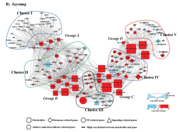 對(duì) 22 個(gè)花青素衍生物和 167 個(gè)基因(三個(gè)馬鈴薯品種中類黃酮代謝、植物激素、信號(hào)通路、轉(zhuǎn)錄因子相關(guān)的差異表達(dá)基因)相關(guān)性分析,發(fā)現(xiàn)有 119 個(gè)基因與這 22 個(gè)花青素衍生物相關(guān)性極高(相關(guān)系數(shù)>0.9)。在 Hongyoung 和 Jayoung 中對(duì)相關(guān)性高的 119 個(gè)基因和22個(gè)代謝物做共表達(dá)網(wǎng)絡(luò)分析,把119個(gè)基因參與的調(diào)控網(wǎng)絡(luò)聚為5組(ClusterI-V),22 個(gè)花青素衍生物參與的代謝通路分為 4 組 (Group A-D) 。