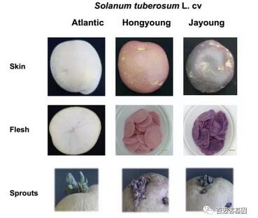樣品準(zhǔn)備:Hongyoung(淡紅色)、Jayoung(深紫色)、Atlantic(白色),在室溫散光照射下,誘導(dǎo)馬鈴薯發(fā)芽,收集嫩芽,每個(gè)品種6個(gè)生物學(xué)重復(fù),每個(gè)重復(fù)由三個(gè)單株混合而成,共18個(gè)樣本。
