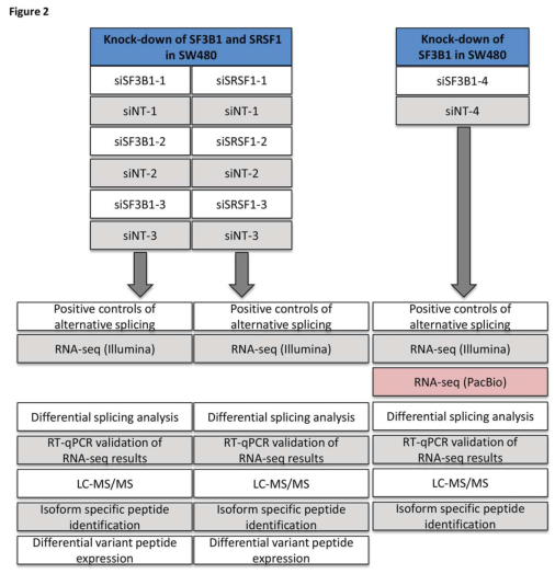 為了測試splicify這種蛋白組學數(shù)據(jù)的分析方法,建立了一種可以對isoform變化進行調(diào)控的實驗?zāi)P停瑢W480結(jié)腸癌細胞系中的剪接因子SF3B1和SRSF1進行siRNA干擾以下調(diào)其表達,然后通過RNA-seq和質(zhì)譜進行結(jié)果檢測。