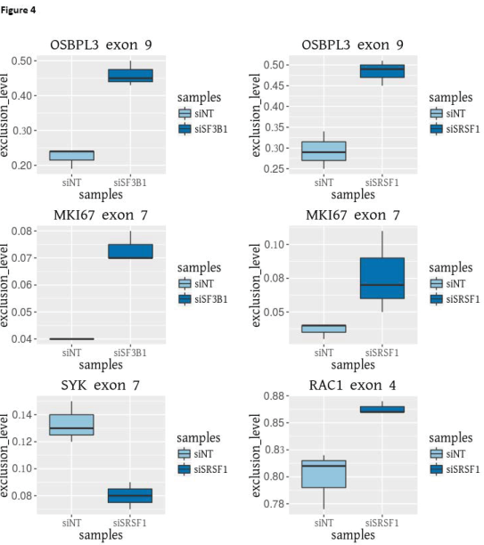 為了進一步驗證,作者選擇了4個外顯子跳躍事件進行RT-qPCR驗證,包括SYK exon 7, RAC1 exon 4, OSBPL3 exon 9, MKI67 exon 7(如圖4所示)。根據(jù)RNA-seq分析,所有的事件在SRSF1下調(diào)后都發(fā)生了差異剪接,而OSBPL3和MKI67則受SF3B1下調(diào)的影響。