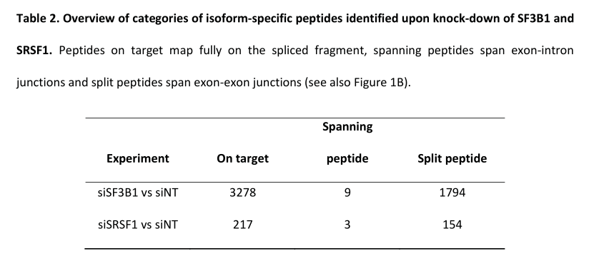 肽段數(shù)量上的差別直接和兩個實驗剪接isoform數(shù)據(jù)庫的數(shù)目相關(guān)。總的來說,大約60%的isoform特異肽段會比對到目標區(qū)域,跨越exon-econ junction的split 肽段約占40%,跨越 exon-intron junctions 的spanning肽段則很少被發(fā)現(xiàn)(如表2所示)。