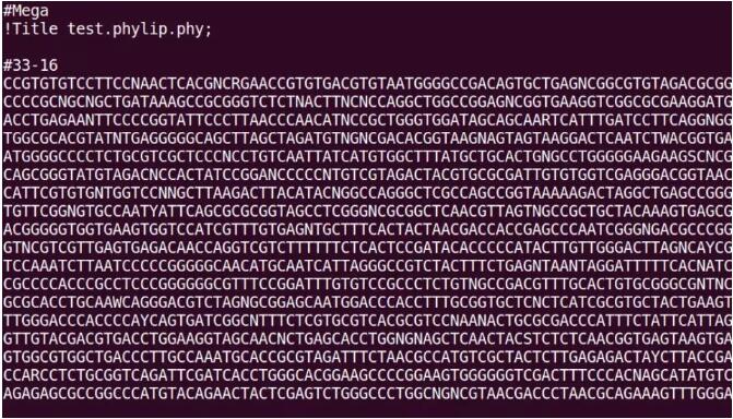 VCF轉(zhuǎn)MEGA格式。用TASSEL打開VCF文件,另存為Phylip格式(Save As — ?Phylip(Interleaved)),如圖3,然后用MEGA7把Phylip文件轉(zhuǎn)換成MEGA格式(File — Convert File Format to MEGA — 選擇剛才轉(zhuǎn)出的Phylip文件按提示操作存成.meg文件),轉(zhuǎn)出的格式如圖4,前兩行為文件頭信息,無實際意義,但是必有?!?33-16”表示樣本編號,與fasta文件的格式不同,mega格式樣本的起始不是“>”而是“#”,接下來便是該樣本的SNP連接成的序列信息。