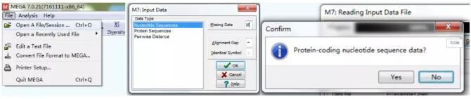 File — Open A File/Session — 選擇要導入的文件,選擇數(shù)據(jù)類型(如果是SNP即為Nuceotide Sequences),提示Protein-coding nucleotide sequence data時,選擇No,即不把DNA序列翻譯成蛋白序列構(gòu)建進化樹,如圖5。