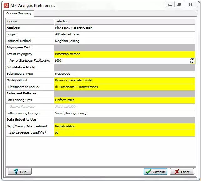 參數(shù)設(shè)置,主要填寫B(tài)ootstrap值,一般選擇500或1000次;Model一般用Kimura 2-parameter Model(K2),如果K2模型運行不了,可以換成p-distance模型;Gaps/Missing Data Treatment選擇Partial deletion或者pairwise deletion,選擇complete deletion時帶有缺失值的標記都會被刪除,所以必須謹慎;Site Coverage Cutoff與我們常說的完整度相同,一般填寫成我們過濾標記時使用的完整度,上述參數(shù)設(shè)置完成后,點擊compute即可。(見圖6)