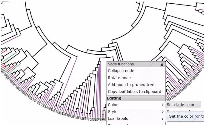 4、分枝顏色的統(tǒng)一。上面的著色例子只對末端分枝進行了著色,有時候,我們需要對某個分枝的樣本進行顏色的統(tǒng)一,可以選中該分枝并點擊鼠標,在彈出的下拉框中選擇color — set clade color — 選擇想用的顏色或填入對應(yīng)的顏色代碼即可。