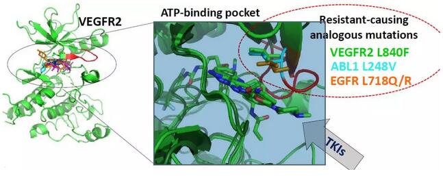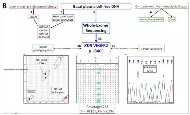 西班牙國家癌癥研究中心(CNIO)胃腸癌臨床研究組的學(xué)者們,納入一例RAS / BRAF / PIK3CA未發(fā)生突變且對抗VEGF抑制劑具有抗性的轉(zhuǎn)移性結(jié)腸直腸癌患者,收集其血漿提取cfDNA,分離白細(xì)胞提取gDNA以及轉(zhuǎn)移組織提取tDNA,進行全外顯子組測序,發(fā)現(xiàn)WES-cfDNA與腫瘤外顯子組測序結(jié)果一致率為77%,且能夠鑒別KDR / VEGFR2 L840F克隆,該體細(xì)胞突變是患者難治性的原因。其他腫瘤數(shù)據(jù)庫如TCGA等KDR體細(xì)胞突變的樣本比例在1-3%,且位于其他癌癥相關(guān)激酶(如EGFR,ABL1和ALK)中經(jīng)常突變的蛋白質(zhì)殘基中。此外,作者還進行了一系列功能實驗,包括不同細(xì)胞系VEGFR2突變體異位表達、激酶和藥物敏感性測定以及細(xì)胞和患者衍生的異種移植瘤實驗。結(jié)果表明,L840F對抗血管生成藥物產(chǎn)生強烈的抗性,而KDR熱點突變體R1032Q賦予對強VEGFR2抑制劑的敏感性。小鼠移植瘤實驗表明VEGFR2突變體D717V,G800D,G800R,L840F,G843D,S925F,R1022Q,R1032Q和S1100F 促進小鼠腫瘤生長。