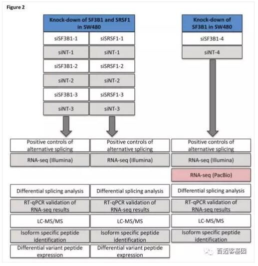為了測(cè)試splicify這種蛋白組學(xué)數(shù)據(jù)的分析方法,建立了一種可以對(duì)isoform變化進(jìn)行調(diào)控的實(shí)驗(yàn)?zāi)P?,?duì)SW480結(jié)腸癌細(xì)胞系中的剪接因子SF3B1和SRSF1進(jìn)行siRNA干擾以下調(diào)其表達(dá),然后通過RNA-seq和質(zhì)譜進(jìn)行結(jié)果檢測(cè)。