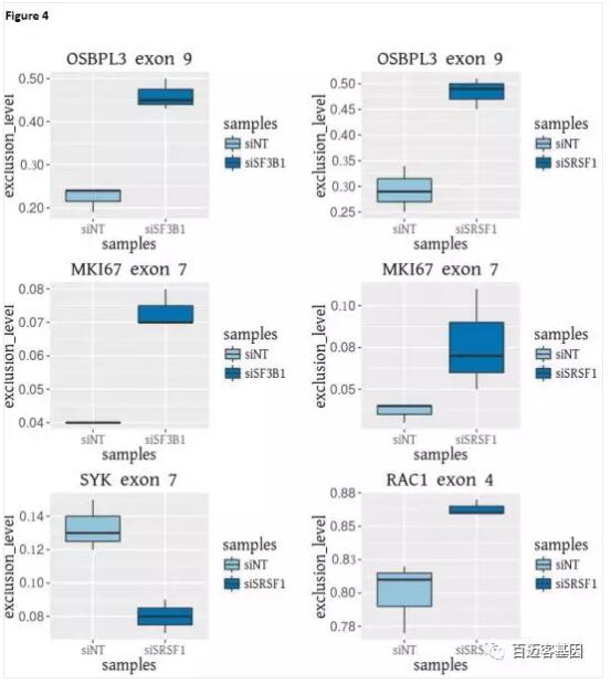為了進(jìn)一步驗(yàn)證,作者選擇了4個(gè)外顯子跳躍事件進(jìn)行RT-qPCR驗(yàn)證,包括SYK exon 7, RAC1 exon 4, OSBPL3 exon 9, MKI67 exon 7(如圖4所示)。根據(jù)RNA-seq分析,所有的事件在SRSF1下調(diào)后都發(fā)生了差異剪接,而OSBPL3和MKI67則受SF3B1下調(diào)的影響。