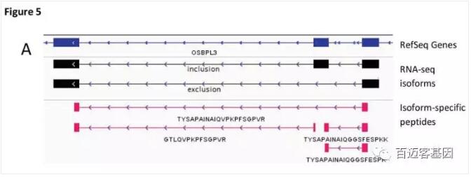 此外,Iso-Seq的測(cè)序結(jié)果揭示了一些由于參考基因組注釋的缺乏沒有檢測(cè)到這些事件。其中最突出的就是內(nèi)含子保留事件,可變剪接分析軟件rMATS使用的是帶注釋的內(nèi)含子保留的數(shù)據(jù)庫(kù),而不是基因組中的所有內(nèi)含子。在蛋白水平上,大多數(shù)isoform特異性肽都可以通過兩種方法鑒定,Iso-seq所測(cè)全長(zhǎng)轉(zhuǎn)錄組本對(duì)于參考基因組的注釋信息是一個(gè)很好的補(bǔ)充,增加了確定的isoform特異肽段的數(shù)量(如圖6C所示)。