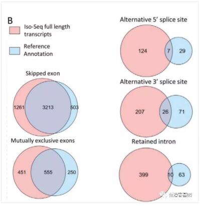 在研究可變剪接方面,Iso-Seq測(cè)到的全長(zhǎng)轉(zhuǎn)錄本對(duì)基因組注釋結(jié)果是一個(gè)極大補(bǔ)充,尤其在內(nèi)含子保留、3 ‘可變剪接和5 ‘端可變剪接事件中,Iso-Seq測(cè)到的全長(zhǎng)轉(zhuǎn)錄本與基因組注釋的重疊較小。這表明,基因組注釋中缺少一些完整的或部分的內(nèi)含子序列可變剪接的isoform形式。