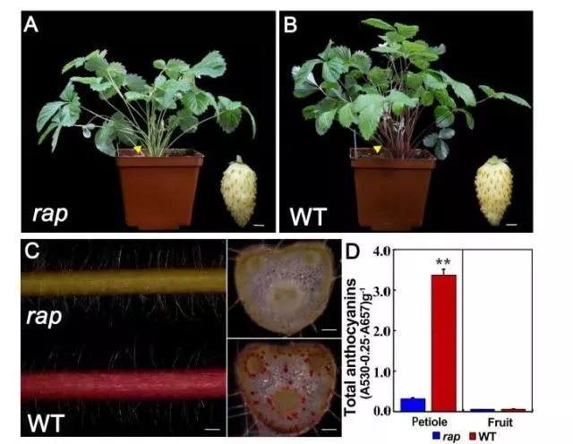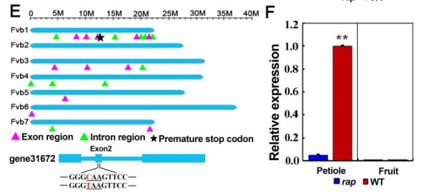 作者利用ENU誘變產(chǎn)生了綠色葉柄和葉片的突變體rap,相較與野生型YW5AF7,rap表皮細(xì)胞的色素沉著大大減少,葉柄的橫截面脈管系統(tǒng)周圍皮層細(xì)胞中顯示出相同的變化,且與色素減少表型相一致的是rap葉片葉柄中總花青素含量顯著降低(P <0.01),rap和YW5AF7對(duì)照果實(shí)中花青素含量都極低(圖1)。通過(guò)對(duì)已知花青素合成途徑相關(guān)基因表達(dá)及測(cè)序分析,RAP為一新基因參與花青素的積累,調(diào)控草莓的生長(zhǎng)發(fā)育。