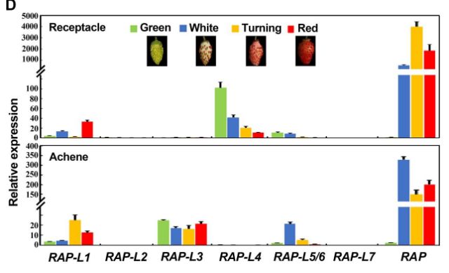 RAP 編碼谷胱甘肽S-轉(zhuǎn)移酶(GST),F(xiàn). vesca中有的7個(gè)GST同源基因,它們被命名為RAP-L1到RAP-L7,qRT-PCR表達(dá)量分析表明,RAP主要在果實(shí)中表達(dá)較高。為了探索它們對(duì)果實(shí)著色的貢獻(xiàn),分別在果實(shí)成熟的過(guò)程的4個(gè)發(fā)育階段檢測(cè)RAP與其它同源基因的表達(dá)趨勢(shì),RAP-L4在綠色階段是表達(dá)最豐富,RAP從著色階段開(kāi)始表達(dá),且表達(dá)量較高(圖3)。