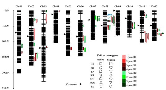研究人員對多個雜交水稻組合的產(chǎn)量優(yōu)勢性狀進(jìn)行多年、多地點(diǎn)的綜合分析發(fā)現(xiàn):每穗小花數(shù)和有效穗數(shù)是造成兩系雜交稻產(chǎn)量優(yōu)勢的主要原因,而且前者有超親優(yōu)勢,后者只有超父本優(yōu)勢。之后對源自LYP9后代的每個重組自交系(RIL)群體進(jìn)行重測序的基礎(chǔ)上,構(gòu)建了一張高分辨率的遺傳連鎖圖,并利用RIL群體及其與母本回交的RILBC1群體進(jìn)行產(chǎn)量相關(guān)性狀的遺傳定位,鑒定了一系列產(chǎn)量及其他優(yōu)勢相關(guān)性狀的QTL位點(diǎn)。同時,結(jié)合對幼穗發(fā)育早期的轉(zhuǎn)錄組分析以及QTL定位的結(jié)果,確定了多個與雜種優(yōu)勢相關(guān)候選基因。此外,還對一個產(chǎn)量雜種優(yōu)勢的主效位點(diǎn)進(jìn)行了圖位克隆,發(fā)現(xiàn)rice heterosis 8 (RH8) 位點(diǎn)實(shí)際上是由DTH8/Ghd8/LHD1編碼的光周期調(diào)控的節(jié)律基因,它同時控制開花期、株高、分蘗數(shù),每穗小花數(shù)等多種性狀。隨后對361份雜交稻(其中包括125份二系雜交稻)的基因型解析后發(fā)現(xiàn),RH8的雜合性是兩系法雜交稻基因型的主要類型。