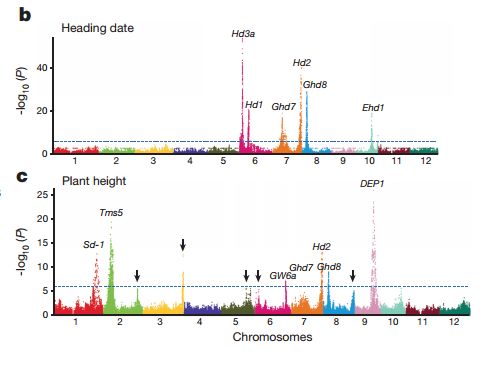作者通過對1495份雜交稻品種材料中17套代表性雜交稻產(chǎn)生的10074 F2遺傳群體進(jìn)行基因組測序和田間產(chǎn)量性狀考察,綜合QTL定位及GWAS分析,鑒定出了控制水稻雜種優(yōu)勢的主要基因位點(diǎn)HD3a、TAC1、LAX1、Ghd8等 。進(jìn)一步研究表明,水稻中雜種優(yōu)勢的表現(xiàn)正是由這些基因位點(diǎn)所決定,在雜交配組中,這些基因位點(diǎn)產(chǎn)生了全新的基因型組合,在雜交一代中高效地實(shí)現(xiàn)了對水稻花期、株型、產(chǎn)量各要素的理想搭配。