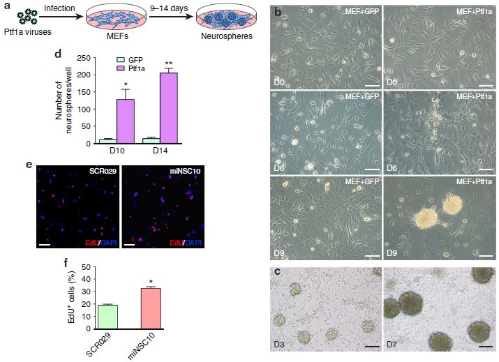 作者研究了Ptf1a是否有能力將MEF直接重編程為iNSC,發(fā)現(xiàn)當(dāng)MEF感染了強(qiáng)力霉素(Dox)可誘導(dǎo)的Ptf1a的慢病毒,并在含表皮生長(zhǎng)因子(EGF)、堿性纖維母細(xì)胞生長(zhǎng)因子(bFGF)和Dox的N3培養(yǎng)基中培養(yǎng)后,它們開始發(fā)生形態(tài)變化,在第6天形成群落,從第9天出現(xiàn)大量神經(jīng)球(圖1 a,b,d)。對(duì)照MEF感染Dox可誘導(dǎo)的GFP的慢病毒,幾乎沒有形成任何正常形狀的神經(jīng)球(圖1 b,d)。當(dāng)將多個(gè)ptf1a誘導(dǎo)的神經(jīng)球作為混合物收集、分離和再培養(yǎng)后,它們從第3天開始迅速形成新的次代神經(jīng)球(圖1c),表明它們具有自我更新能力。