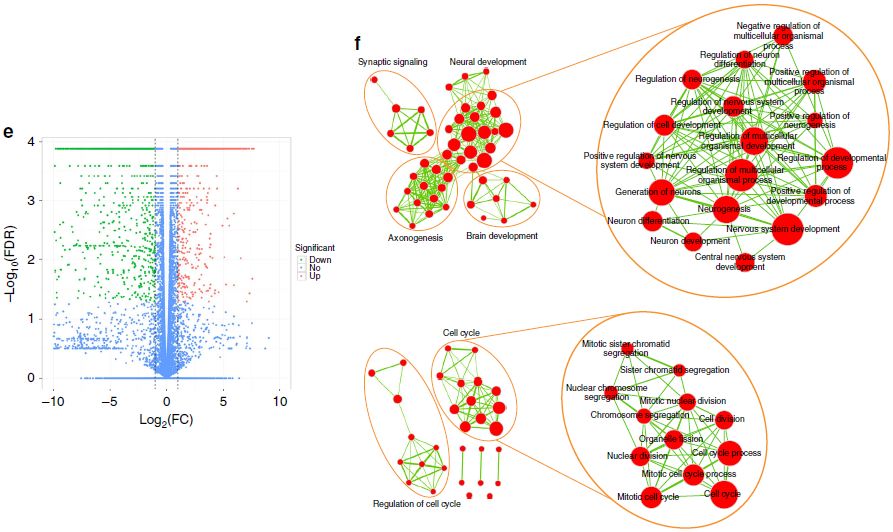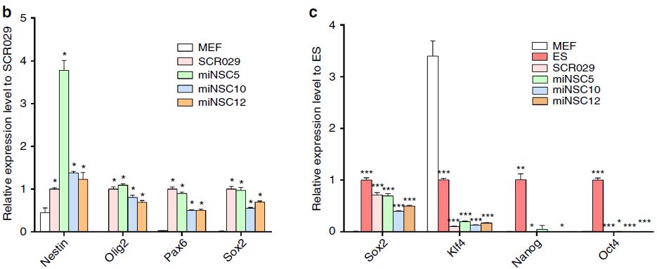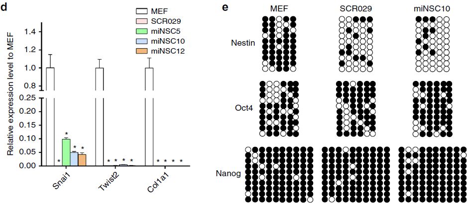 為了進(jìn)一步確認(rèn)這些miNSC的NSC身份,作者對(duì)miNSC10、SCR029和MEF細(xì)胞進(jìn)行了RNA-seq分析。miNSC10、SCR029和MEF細(xì)胞中基因表達(dá)水平的散點(diǎn)圖顯示,miNSC10和SCR209細(xì)胞的基因表達(dá)水平相似,但均與MEF存在顯著差異(圖3a-c)。與這些結(jié)果一致的是,聚類分析也顯示出miNSC10和SCR029細(xì)胞之間有很高的相似性,但它們與MEF之間有很大的差異(圖3d)。與MEF相比,miNSC中有許多基因表達(dá)水平下調(diào)或上調(diào)(圖3e)。作者對(duì)上調(diào)基因進(jìn)行基因集富集分析(GSEA),發(fā)現(xiàn)了兩組主要的富集基因GO term(圖3f)。其中一組在與神經(jīng)發(fā)育相關(guān)的GO term中富集,如神經(jīng)發(fā)生、神經(jīng)元分化、神經(jīng)系統(tǒng)發(fā)育、神經(jīng)發(fā)生調(diào)節(jié)、大腦發(fā)育和軸突發(fā)生。另一組富集在細(xì)胞分裂GO term,包括細(xì)胞分裂、有絲分裂細(xì)胞周期、核分裂、姐妹染色單體分離、細(xì)胞周期調(diào)控。這些數(shù)據(jù)與miNSC作為NSC及其增殖和自我更新能力是一致的。與此一致的是,進(jìn)一步的分析顯示,盡管有一定的差異,但miNSC10、SCR029、NS528(小鼠ES細(xì)胞來源的NSC)和ciNSC10 (化學(xué)誘導(dǎo)MEF形成的NSC)細(xì)胞之間的相似性比MEF更大。