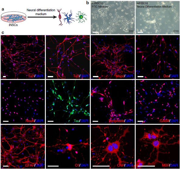作者想要解決的問題是由非神經(jīng)前體細(xì)胞TF Ptf1a重編程的miNSC是否可以與NSC 一樣,具有分化成神經(jīng)元、星形膠質(zhì)細(xì)胞和少突膠質(zhì)細(xì)胞的潛力(圖4a)。當(dāng)在神經(jīng)分化培養(yǎng)基中培養(yǎng)時(shí),短短幾天內(nèi),miNSC就發(fā)生了穩(wěn)健的形態(tài)學(xué)變化,細(xì)胞體積變小、普遍的神經(jīng)突擴(kuò)張(圖4b)。在培養(yǎng)的2-3周,許多細(xì)胞分化為Tuj1、Map2、Dcx、NeuN、Tau、peripherin或GABA免疫的神經(jīng)元(圖4c)。3周時(shí)的定量顯示,83.3%的細(xì)胞呈Tuj1陽(yáng)性(圖4e)。此外,不同miNSC細(xì)胞系(miNSC5、10、12)顯示類似的分化成Tuj1或Map2免疫的神經(jīng)元的能力(補(bǔ)充圖8)。在星形膠質(zhì)細(xì)胞分化條件下,87.2%的分化細(xì)胞形成神經(jīng)膠質(zhì)原纖維酸性蛋白(GFAP)免疫的星形膠質(zhì)細(xì)胞(圖4 c,e),少突膠質(zhì)細(xì)胞分化培養(yǎng)基中,miNSC能夠分化為O1、CNP或MBP免疫的少突膠質(zhì)細(xì)胞,而26.6%的分化細(xì)胞為O1陽(yáng)性(圖4 c,e)。因此,ptf1a重編程的miNSC具有三能性,能夠分化為神經(jīng)元、星形膠質(zhì)細(xì)胞和少突膠質(zhì)細(xì)胞。