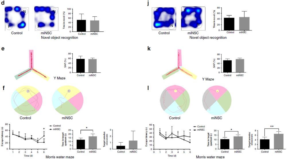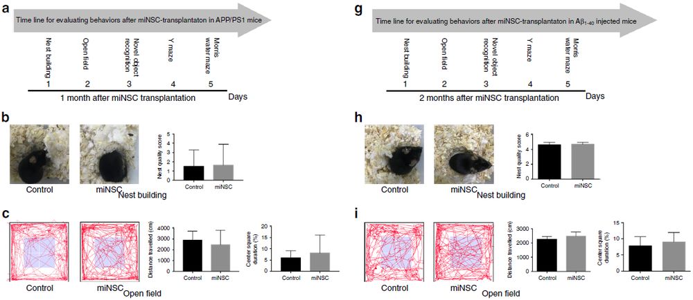 作者也評(píng)估了miNSC對(duì)β-淀粉樣蛋白1-40(Aβ1-40)損傷AD小鼠模型的治療潛力。首先確定了Aβ1-40損傷小鼠的學(xué)習(xí)和記憶障礙小鼠與AD類似。將GFP標(biāo)記的miNSC在注射Aβ1-40 2周后移植到相同位置。兩個(gè)月后,作者進(jìn)行了同樣的行為學(xué)試驗(yàn),發(fā)現(xiàn)移植miNSC可以顯著提高APP / PS1和Aβ1-40損傷AD小鼠模型的空間學(xué)習(xí)和記憶能力,療效與ESC來源的NSC相似(圖6g-k)。