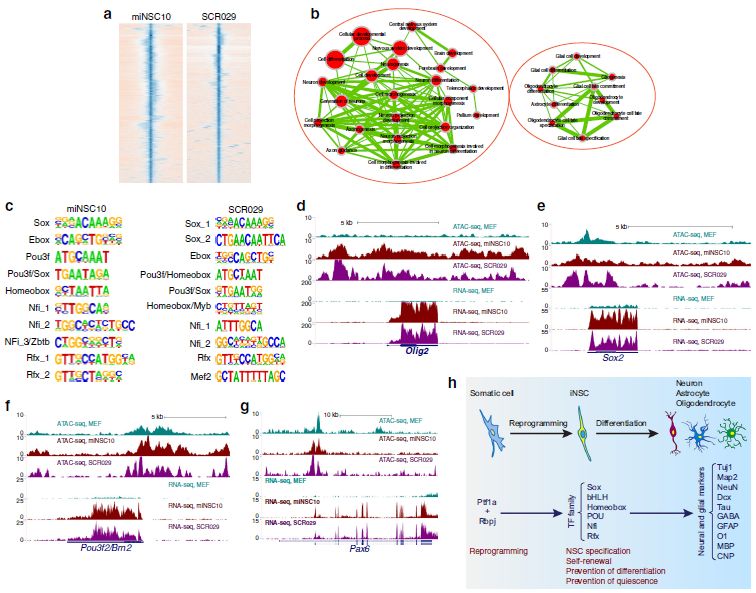 miNSC10 iNSC和SCR029 NSC的ATAC-seq結(jié)果表明,peak關(guān)聯(lián)基因富集在神經(jīng)發(fā)生、神經(jīng)元發(fā)育、大腦發(fā)育、膠質(zhì)細(xì)胞發(fā)育(圖8a, b),與NSC特征一致。在peak峰值中心300 bp窗口中鑒定新motif,說明miNSC10和SCR029細(xì)胞都富集了類似的屬于多個(gè)TF家族的TF結(jié)合motif,TF家族包括Sox、bHLH (Ebox)、Pou3f、homeobox、Nfi和Rfx(圖8c)。相應(yīng)地,RNA-seq數(shù)據(jù)顯示,與MEF相比,這些TF基因家族的多個(gè)成員在miNSC10和SCR029細(xì)胞中上調(diào)或高表達(dá)。qRT-PCR證明,除了Sox2之外,Sox5、6、8、21在miNSC10和SCR029細(xì)胞中均表達(dá)上調(diào)。一般來說,miNSC10細(xì)胞的ATAC-seq圖譜與SCR029細(xì)胞相似,但與MEF完全不同;而對(duì)于上調(diào)的TF基因,如Olig2(bHLH)、Sox2、Pou3f2/Brn2、Pax6 (homeobox),與MEF相比,miNSC10和SCR029細(xì)胞中這些位點(diǎn)具有更多的峰和/或差異峰(圖8d-g),說明更開放的染色質(zhì)結(jié)構(gòu)增加了基因表達(dá)。