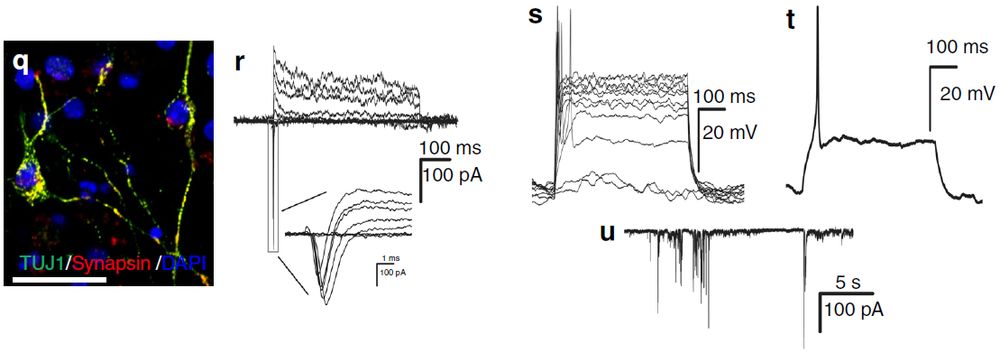 根據(jù)qRT-PCR結(jié)果,ptf1a重編程的hiNSC幾乎不表達(dá)多能性基因OCT4和NANOG。相反,它們高表達(dá)NSC標(biāo)志蛋白,包括SOX2、PAX6、NESTIN、OLIG2和FABP7(圖9 e-i)。體外分化試驗(yàn)表明hiNSC具有三能性(圖9p,j-n)因此,Ptf1a具有類似的活性,可將人類成纖維細(xì)胞重編程形成三能性NSC。作者通過突觸素染色標(biāo)記試驗(yàn)、電生理特性分析表明,ptf1a重編程的miNSC能夠分化為功能神經(jīng)元(圖9q,r-u)。