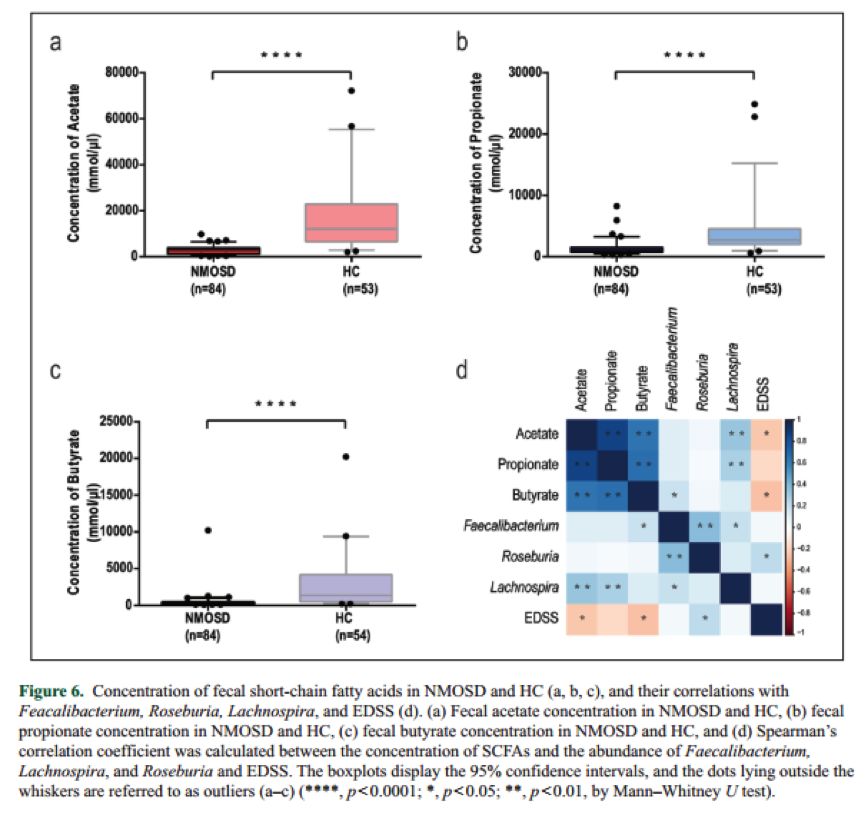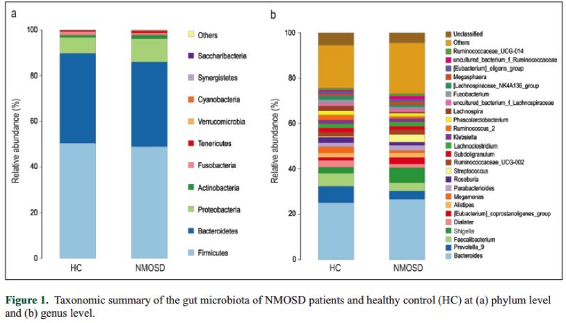 視神經(jīng)脊髓炎譜系疾病(NMOSD)是一種中樞神經(jīng)系統(tǒng)(CNS)的炎癥性自身免疫疾病,是視神經(jīng)和脊髓同時或相繼受累的急性或亞急性脫髓鞘病變。視神經(jīng)脊髓炎譜系疾病具有高復(fù)發(fā)和高致殘性,具有人種差異和性別差異(男女患病比例為1:10),通常與其他自身免疫疾病(如系統(tǒng)性紅斑狼瘡、橋本氏病等)共病。長期以來,NMOSD可通過免疫學(xué)標(biāo)記(如水通道蛋白-4抗體,AQP4-IgG)或遺傳基因標(biāo)記(如人類白細(xì)胞抗原,HLA)鑒定,與幽門螺桿菌等病原相關(guān)的抗體在NMOSD患者的腸胃中也被普遍發(fā)現(xiàn)。NMOSD患者腸道微生物的研究目前仍較少,本文采用高通量測序(NGS)和氣相色譜(GC)技術(shù),分析了NMOSD患者的腸道微生物與短鏈脂肪酸(SCFAs)變化情況。