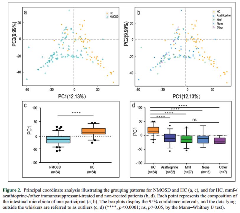 首先,擬桿菌門(Bacteroidetes)、厚壁菌門(Firmicutes)和變形菌門(Proteobacteria)這3門菌在腸道含量最多(圖 1a);擬桿菌屬(Bacteroides)、普氏菌屬(Prevotella)、志賀氏菌屬(Shigella)和糞球菌屬(Faecalibacterium)占腸道微生物的(屬水平)70%(圖 1b)。PCA分析顯示NMOSD與HCs人群腸道微生物組成有明顯差異(p<0.001,Mann–Whitney U)(圖 2a;2c),而不同免疫抑制治療劑與非治療對腸道微生物的組成影響不大(圖 2b;2d)。