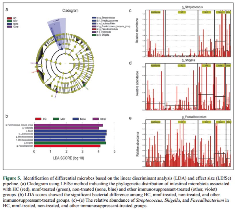 免疫抑制治療比較發(fā)現(xiàn),鏈球菌屬(Streptococcus)、志賀氏菌屬(Shigella)主要集中于NMOSD人群,糞球菌屬(Faecalibacterium)在HC人群中最豐富。與非治療組相比,NMOSDs人群的鏈球菌屬(Streptococcus)在使用mmf、azathioprine后略有降低(圖 5c),但在HC人群中更低。與非治療相比,NMOSDs人群的免疫抑制治療劑(mmf、azathioprine & others)治療對志賀氏菌屬(Shigella)的抑制作用不明顯(圖 5d)。雖然,HC人群比非治療NMOSDs人群的糞球菌屬(Faecalibacterium)略高,然而,免疫抑制治療劑(mmf、azathioprine)使糞球菌屬(Faecalibacterium)反而顯著降低(圖 5e)。