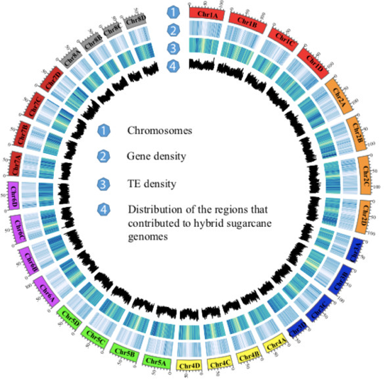 利用BAC文庫進(jìn)行二代測(cè)序,ALLPATH-LG,SPAdes 和SOAPdenovo2進(jìn)行初步組裝,進(jìn)一步利用87X 三代PacBio數(shù)據(jù)進(jìn)行糾錯(cuò),CANU進(jìn)行組裝,組裝基因組3.13G,contigN50=45 kb(流式評(píng)估基因組大?。?.36G);通過Hi-C染色體掛載技術(shù),針對(duì)多倍體染色掛載新算法ALLHIC,進(jìn)一步將contig水平提升至染色體水平,掛載率達(dá)到93%;通過BUSCO和二代數(shù)據(jù)回比評(píng)估基因組完整性高達(dá)97.3%。再通過MAKER對(duì)同源多倍體甘蔗特異等位基因進(jìn)行手動(dòng)注釋,以獲得高質(zhì)量的甘蔗基因組