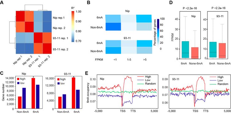 RNA-seq分析表明在Nip和93-11中,在6mA位點有大量的高表達基因甲基化,大量未甲基化基因在低水平表達。6mA甲基化基因的表達水平顯著高于非6mA基因,并且高表達基因顯示出較高的6mA占用率,特別是在啟動子和基因體區(qū)域中包含6mA位點的基因。6mA與水稻中的活性表達基因有關(guān)。5mC在水稻基因組中高豐度存在,影響基因表達,研究發(fā)現(xiàn)5mC和6mA之間沒有相關(guān)性(圖4)。