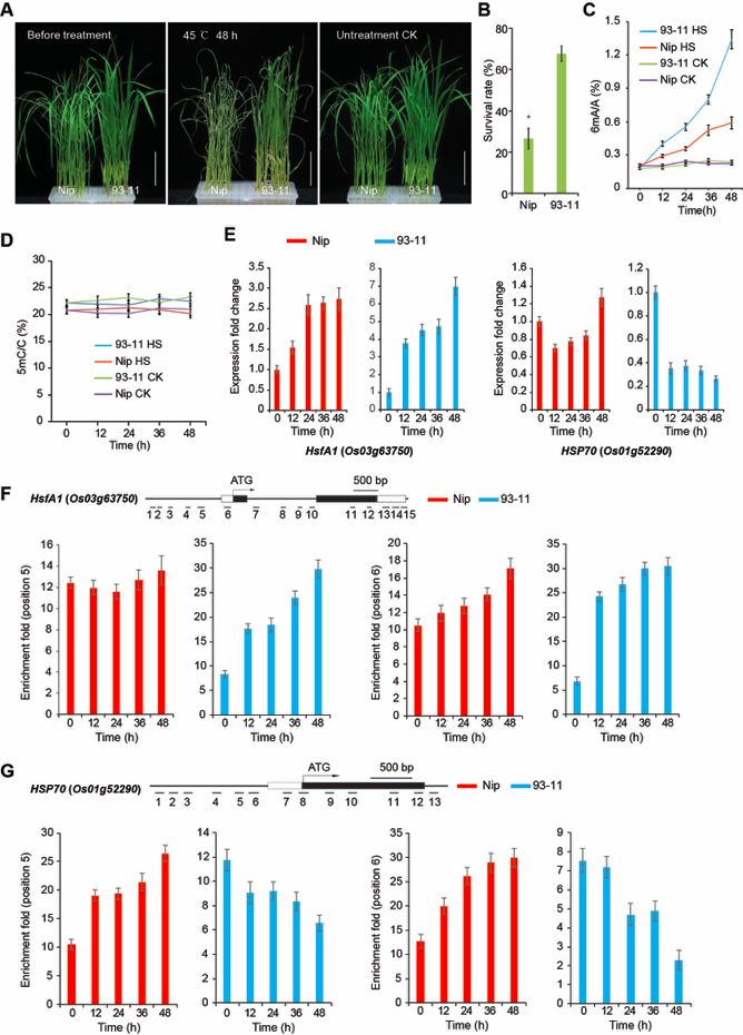 根據(jù)SMRT測序結(jié)果,篩選出候選的6mA修飾的熱脅迫相關(guān)基因,如熱休克轉(zhuǎn)錄因子A1(HsfA1)和熱休克蛋白70(HSP70)。HSFA1是熱脅迫反應(yīng)的主要轉(zhuǎn)錄調(diào)控因子,其在非脅迫條件下受到HSP70的抑制。HSFA1功能缺失導(dǎo)致熱脅迫敏感表型。HsfA1和HSP70表達的變化與其6mA水平的變化呈正相關(guān),這可能是Nip和93-11之間熱脅迫耐受性差異的原因。