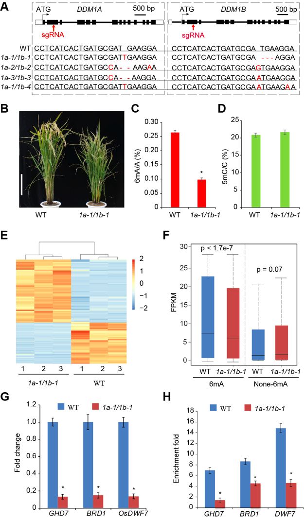 水稻基因組含有兩個DDM1同源基因DDM1a和DDM1b,由于功能冗余,只有T-DNA插入單突變體產(chǎn)生的雙突變體DDM1a/1b表現(xiàn)出發(fā)育表型。然而,DDM1a/1b不產(chǎn)生活花粉,導(dǎo)致種子呈空殼和深色。用CRISPR-Cas9對Nip背景中的DDM1a和DDM1b進行了有針對性的誘變,并鑒定了10個獨立的T1系用于DDM1a、DDM1b單突變和4個獨立的DDM1a/DDM1b(1a/1b)雙突變型。在任何不同類型的DDM1a或DDM1b純合子單突變體中均未觀察到表型。與野生型植物相比,所有純合1a/1b系表現(xiàn)出相同的矮化表型。1a-1/1b-1顯示出降低的結(jié)實率,而另外3個雙突變體顯示不育。LC-MS/MS對DNA甲基化水平的定量測量顯示6mA水平顯著降低,但1a/1b植物中5mC水平變化不大。6mA-IPqPCR分析顯示,6mA水平在大多數(shù)隨機選擇的位點中顯著降低。RNA-seq結(jié)果表明野生型中6mA修飾基因的表達水平顯著高于1a-1/1b-1植物中的相同基因,野生型中非6mA基因與1a-1/1b-1植物中的相應(yīng)基因之間沒有表達水平差異。結(jié)果表明6mA水平與基因表達呈正相關(guān)。