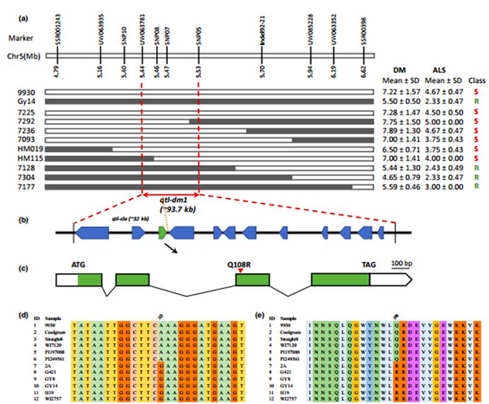注:a~c為精細定位過程,d為DNA序列比對,e為蛋白質序列比對