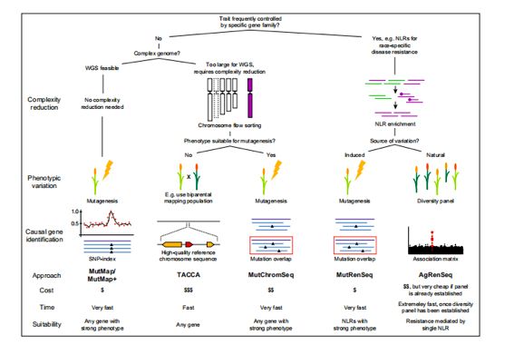 TILLING,即Targeting Induced Local Lesions IN Genomes(定向誘導(dǎo)基因組局部突變技術(shù)),是由Steven Henikoff領(lǐng)導(dǎo)的研究小組發(fā)展起來的,TILLING技術(shù)借助高通量的檢測(cè)手段,快速有效地從由化學(xué)誘變劑(EMS)誘變過的突變?nèi)后w中鑒定出點(diǎn)突變。目前此技術(shù)廣泛應(yīng)用于作物研究中,另外還有基因全基因組重測(cè)序的MutMap和MutMap +方法,實(shí)現(xiàn)功能基因的快速定位。MutRenSeq和MutChromSeq也應(yīng)用于突變基因定位,2016年John Innes Centre組織利用EMS誘變產(chǎn)生的小麥突變體,使用液相捕獲技術(shù),通過特異性的RNA捕獲探針對(duì)目標(biāo)區(qū)域進(jìn)行富集,二代測(cè)序后,通過比對(duì)野生型和抗性突變體的序列,找到了目標(biāo)抗性基因。MutChromSeq在此基礎(chǔ)上進(jìn)行改進(jìn),利用流式細(xì)胞儀技術(shù)將含目標(biāo)基因的單條染色體分離出來,后期結(jié)合高通量測(cè)序,通過比較突變體及野生型的差異,快速克隆基因,此方法大大降低重測(cè)序的難度,減少了其它染色體序列對(duì)目標(biāo)序列的影響。